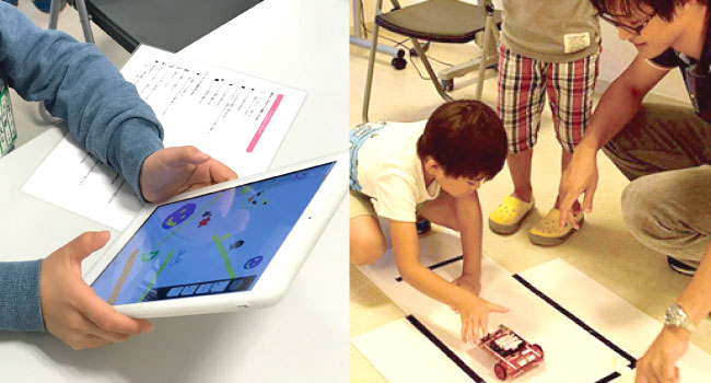 アイコン操作で行うプログラミングで車型のロボットを動かすことや楽しくゲームや絵本を作りながら、プログラミングを学ぶ事ができます。